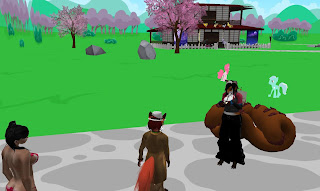 As Mindy and I were talking, one player, Asuka, came over asking where the ponies were. Mindy offered to take her to the "Neighasaki" level, "We have noticed all the names in the MLP universe are a spinoff of horse acronyms." The three of us went up there, and in no time at all, ponies started appearing around us. The area itself was bright and cartoony, Mindy telling me, "As you can see, we do design the levels to represent there respective designs, so people may RP as they wish here as well. ... You have to thank Ivy for that, she is the lead texture artist and designer. She's the one who designed most of the current levels."